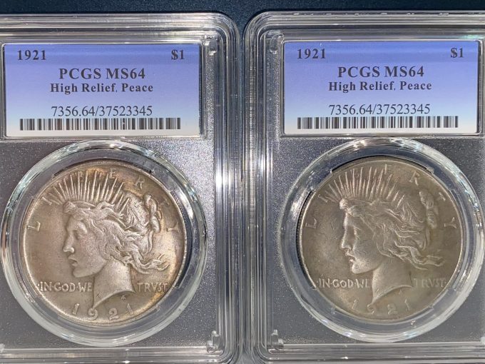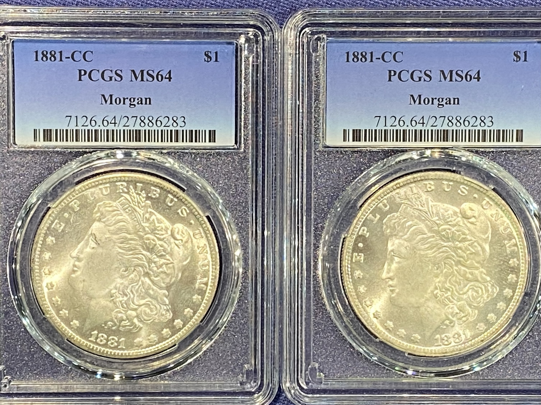 Recent examples of fakes using the same cert numbers include counterfeit 1881-CC Morgan dollars with fake PCGS certification as MS64 and counterfeit 1921 High Relief Peace dollars with fake PCGS certification as MS64.