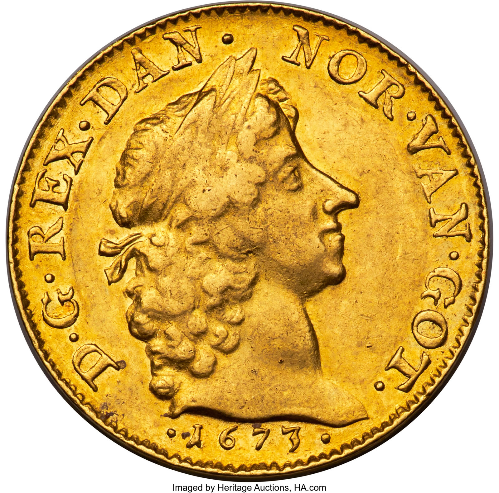 A Norway: Christian V gold 2 Ducat 1673 AU55 NGC (estimate: $40,000+) is an exceedingly rare representative from King Christian V, who ruled over Denmark and Norway from 1670-99.