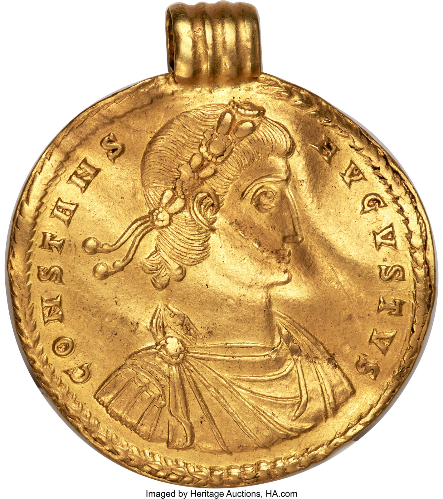 A Constans, as Augustus (AD 337-350). AV 4-1/2 solidi (40mm (45mm with suspension), 21.08 gm, 6h). NGC (photo-certificate) AU 5/5 – 1/5, wrinkled, scuffs, mounted (estimate: $80,000+) is the previously unknown companion piece to RIC VIII 128 — Constantius II medallion of 4.5 solidi (20.17 gm).
