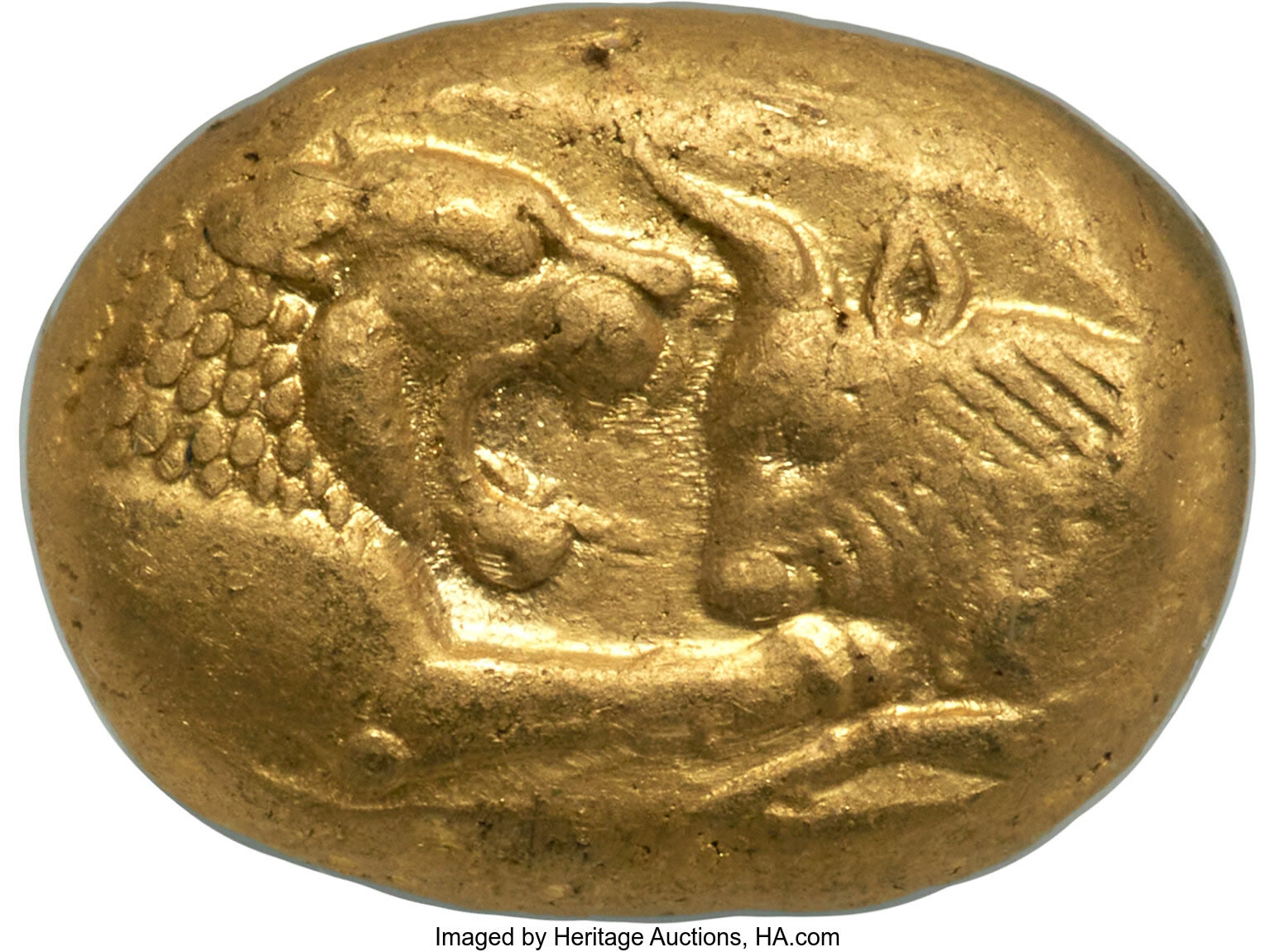 A LYDIAN KINGDOM. Croesus (561-546 BC). AV stater (17mm, 10.77 gm). NGC MS★ 5/5 – 5/5 (estimate: $100,000+) is an exceptionally well-struck example from the series that can be called the "world’s first major gold coinage." The Lydian kingdom and several Greek city states of Asia Minor previously had struck coins in electrum, a natural alloy of gold and silver, but the accession of Croesus to the Lydian throne, circa 561 BC, brought with it a revolution in the world economy. Among the most significant results was the introduction of a bimetallic coinage in gold and silver — first augmenting and then replacing electrum issues.