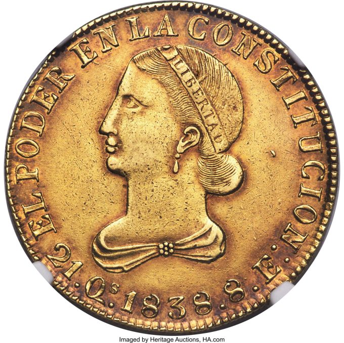 An Ecuador: Republic gold 8 Escudos 1838 QUITO-MV AU55 NGC (estimate: $20,000+) is among the great rarities of Ecuadorian origin and the first date of this exceedingly elusive type. This is only the second of this denomination ever handled at Heritage Auctions, and the first of this date and assayer combination to come to market since the Eliasberg specimen, a lesser example designated XF40 by NGC that brought $27,600 in 2005. The offered example is the finest of three between both grading services by 15 grade points.