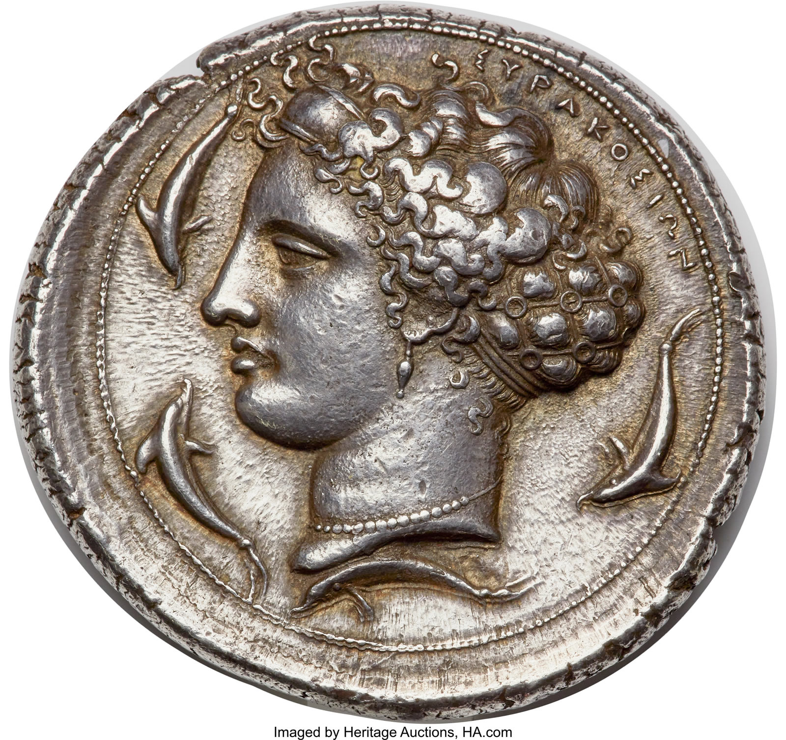 A SICILY. Syracuse. Unsigned dies by Kimon, ca. 405-400 BC. AR decadrachm (40mm, 43.21 gm, 9h). NGC Choice XF★ 4/5 – 5/5, Fine Style (estimate: $150,000+) is part of the series of silver decadrachms by Kimon and Euainetos that were struck in considerable numbers, likely to pay the Greek mercenary soldiers who flooded Sicily to fight the expanding power of Carthage.