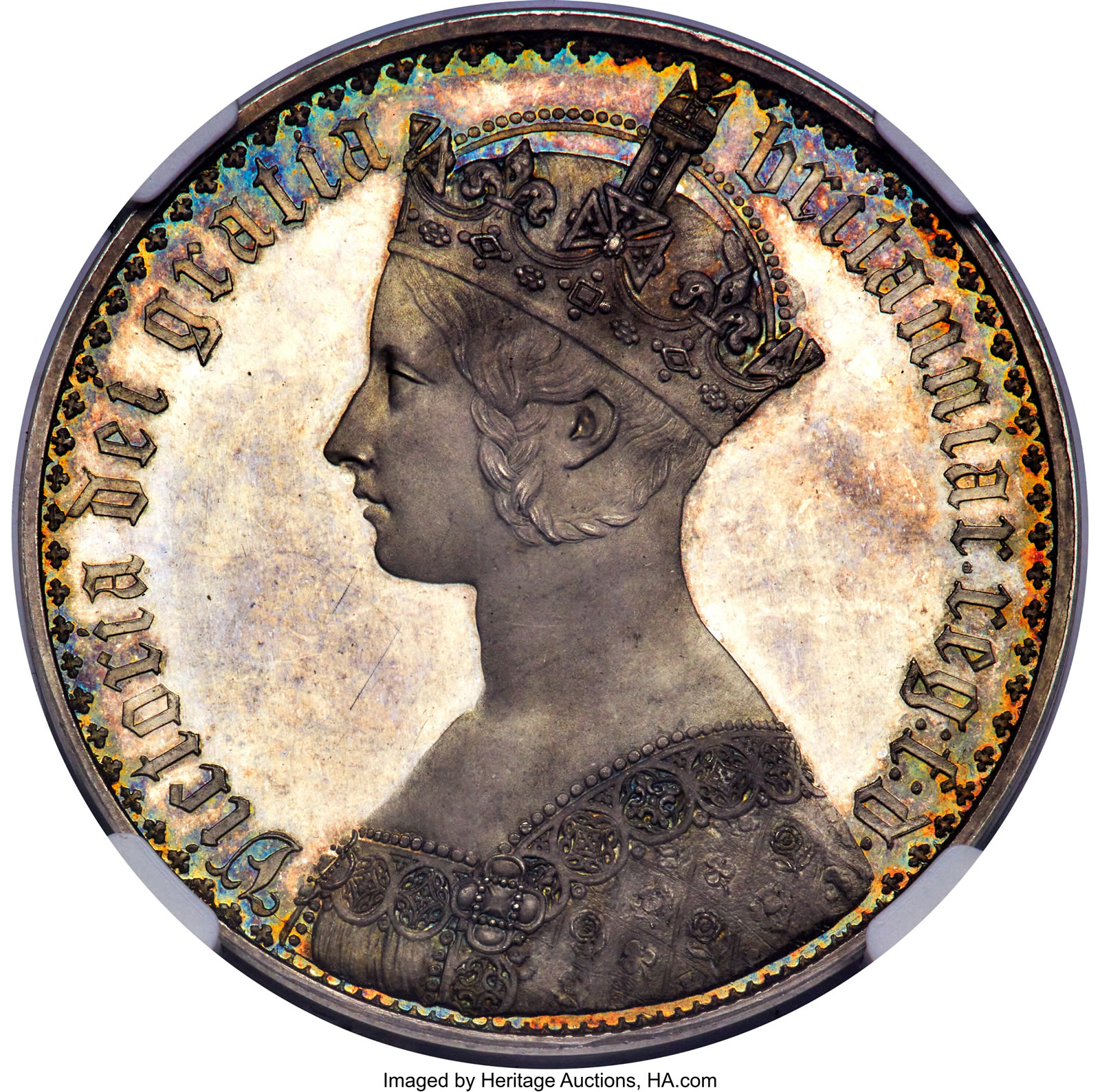 A Great Britain: Victoria Proof "Gothic" Crown 1847 PR64 Cameo NGC (estimate: $30,000+) is a spectacular example of this rare subvariety, distinguished by the pure silver planchet and plain edge.