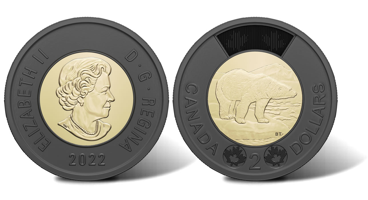 This circulation coin was launched on December 7, 2022, when thousands of visitors flocked to the Mint’s Ottawa and Winnipeg boutiques, to trade their loose change for an affordable and memorable keepsake by which to remember the late queen. It features the traditional Brent Townsend polar bear design on the core of the reverse, as well as the Susanna Blunt effigy of Her Late Majesty on the obverse. While the metal composition of the coin remains unchanged, the outer ring is black. Click here for more information.