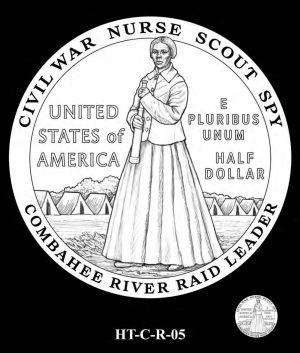 HT-C-R-05 includes a row of Civil War-era tents lining the horizon and depicts Harriet Tubman holding a spyglass, symbolic of her work as a scout and a spy for the Union Army during the U.S. Civil War. Additional inscriptions include "CIVIL WAR," "NURSE," "SCOUT," "SPY," and "COMBAHEE RIVER RAID LEADER."