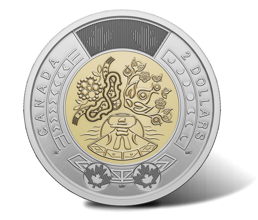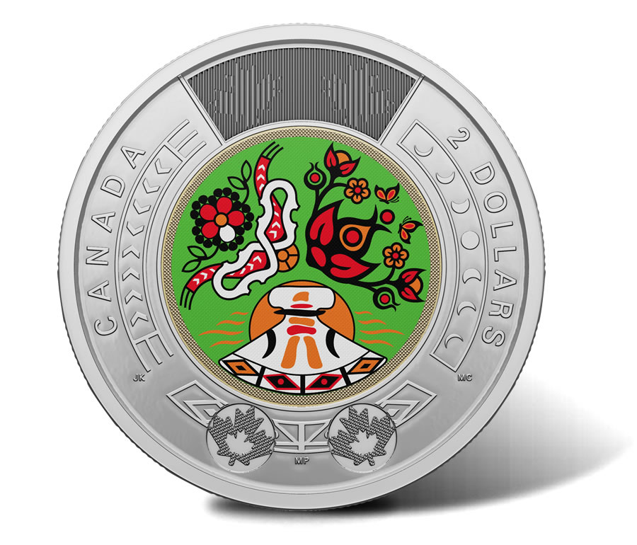 Limited to a mintage of three million coins, of which two million will be coloured, this new $2 circulation coin started circulating on June 21, to correspond with National Indigenous Peoples Day. It will reach Canadians through their change as bank branches and businesses replenish their inventories of $2 coins.