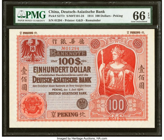 The single finest graded example of a China Deutsch-Asiatische Bank, Peking 100 Dollars 1.7.1914 Pick S277r S/M#T101-24 Remainder PMG Gem Uncirculated 66 EPQ (30L) in the PMG Population Report brought nearly twice its pre-auction estimate when it sold for $55,200. The Deutsch-Asiatische Bank was the first large non-British bank to operate in China, and in 1906 was granted permission to issue banknotes, which led to a variety of denominations that were printed and issued over the next decade via branches in Hankow, Peking, Shanghai and Tientsin, as well as in Kiau Chau.