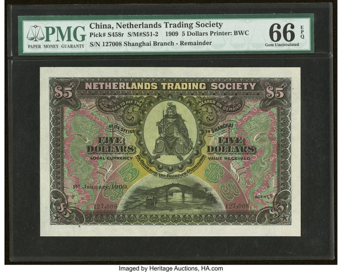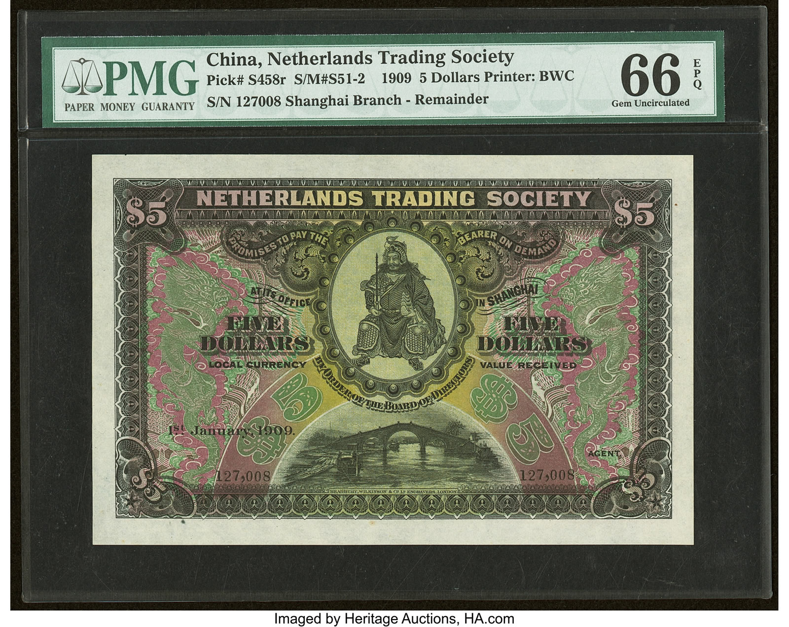 Yet another record fell when the only known Remainder example graded in the PMG Population Report of a China Netherlands Trading Society 5 Dollars 1.1.1909 Pick S458r S/M#S51-2 Remainder PMG Gem Uncirculated 66 EPQ reached $33,600. With its roots in a 19th-century Dutch venture in Hong Kong, the Netherlands Trading Society only issued banknotes in two series: 1909 and 1922. Issuance was small, making issued banknotes, Specimen and Remainders very rare. It is fully printed, with a date and serial numbers, but it was never signed and issued.