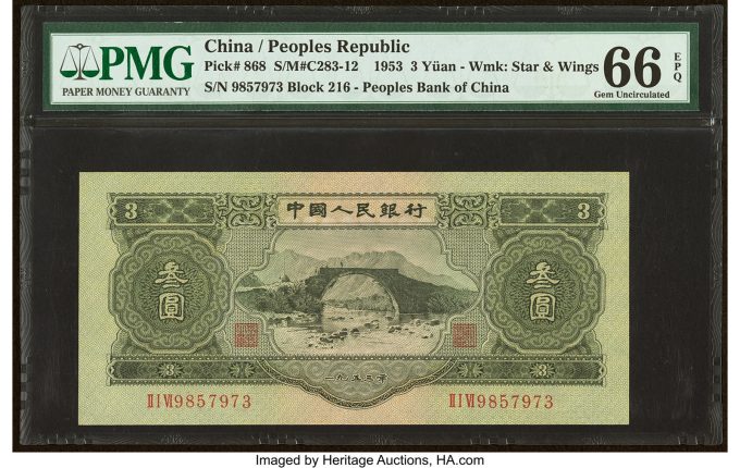 A People’s Bank of China 3 Yuan 1953 Pick 868 S/M#C283-12 PMG Gem Uncirculated 66 EPQ, an uncirculated version of this rare and short-lived note also more than doubled its pre-auction estimate when it finished at a record $66,000. The result is befitting of this magnificent note, which is exceptionally difficult to find in such a high grade; its elusiveness is a result, in part, of its introduction as a sign of friendship between China and the Soviet Union. The plates were manufactured in the Soviet Union; due to the Sino-Soviet Split, the design was not renewed, which only increase its collectability.
