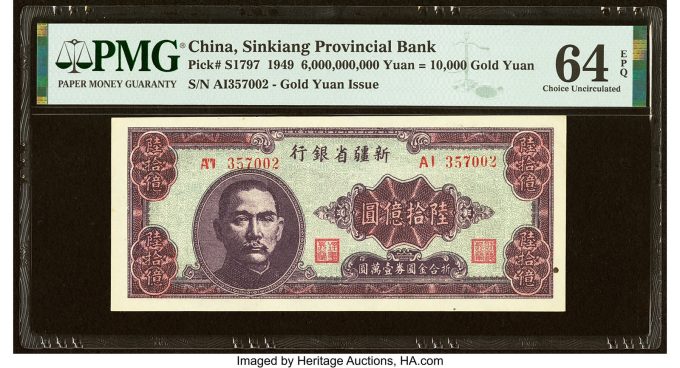 A Chinese Sinkiang Provincial Bank 6,000,000,000 Yuan = 10,000 Gold Yuan Pick S1797 PMG Choice Uncirculated 64 EPQ, the largest known denomination for any Chinese banknote, drew the largest result ever when it more than doubled its pre-auction estimate, ending at $78,000. Few examples of this high denomination from the 1949 Gold Yuan issue exist due to the combination of the purchasing power of this note at the time and the short lifespan of the bank, and even with that limited available, this example stands out, as one of just two registered in Uncirculated condition in the PMG Population Report.