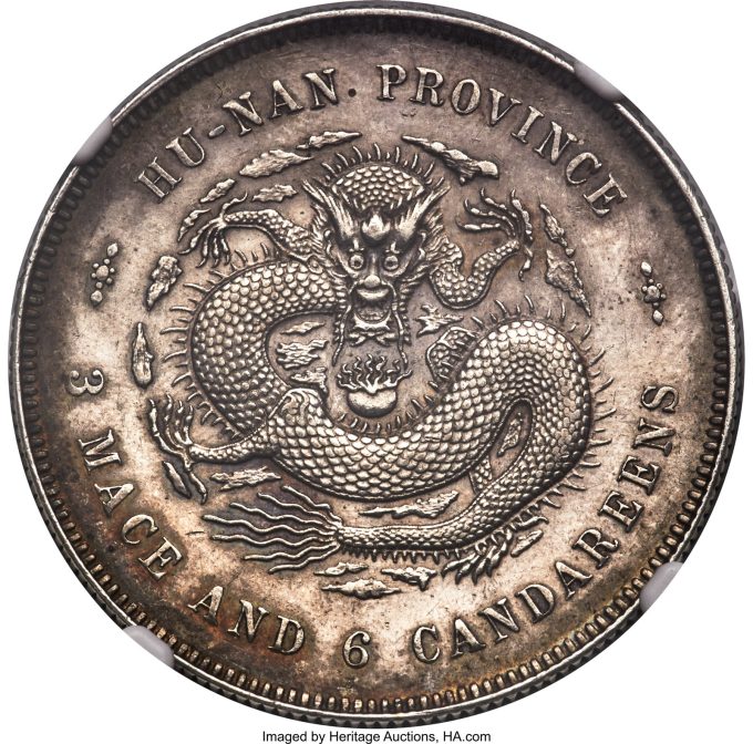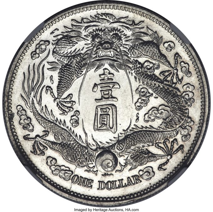 A Hsüan-t’ung silver Specimen Pattern "Long-Whiskered Dragon" Dollar Year 3 (1911) SP63 NGC sold for $690,000 to lead Heritage Auctions’ HKINF World Coins Platinum Session and Signature® Auction – Hong Kong to $9,675,525 June 21-23.