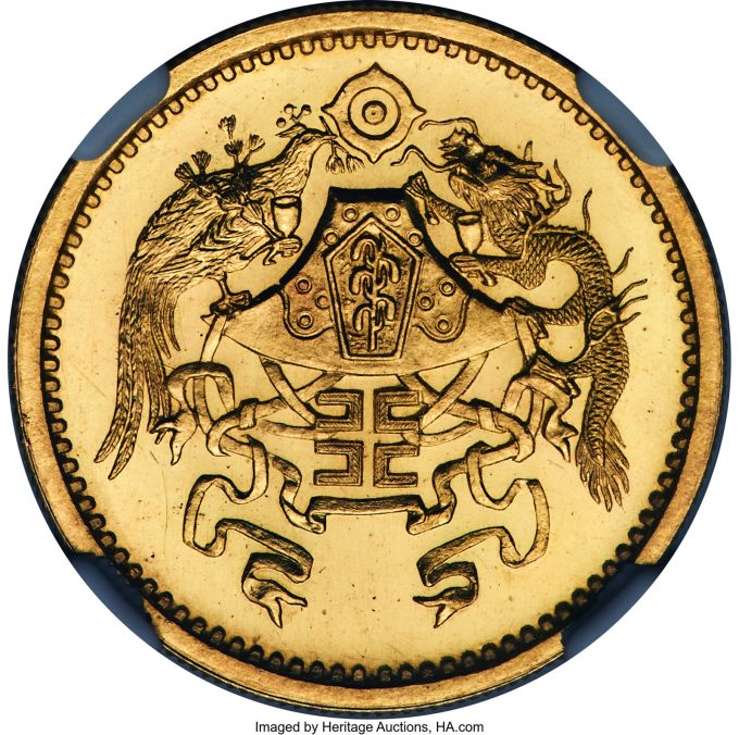 A Shantung. Republic gold Pattern "Dragon & Phoenix" 20 Dollars 1926 MS64 NGC more than tripled its pre-auction estimate when it rode 25 bids to a final result of $372,000. This example is one of only a handful of 20 Dollar Patterns that have surfaced in the last couple of decades, the last at Heritage being the MS64 2014 Ultima specimen.