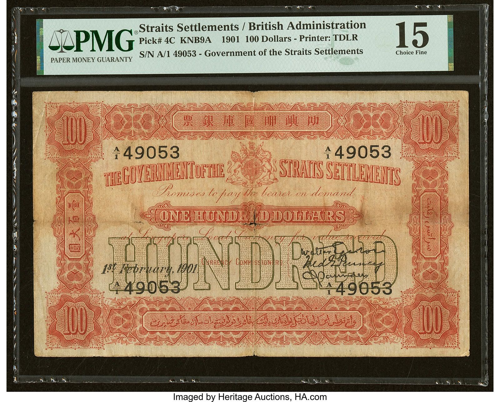 - A Straits Settlements Government of the Straits Settlements 100 Dollars 1.2.1901 Pick 4Cx Contemporary Counterfeit PMG Choice Fine 15: $19,200
