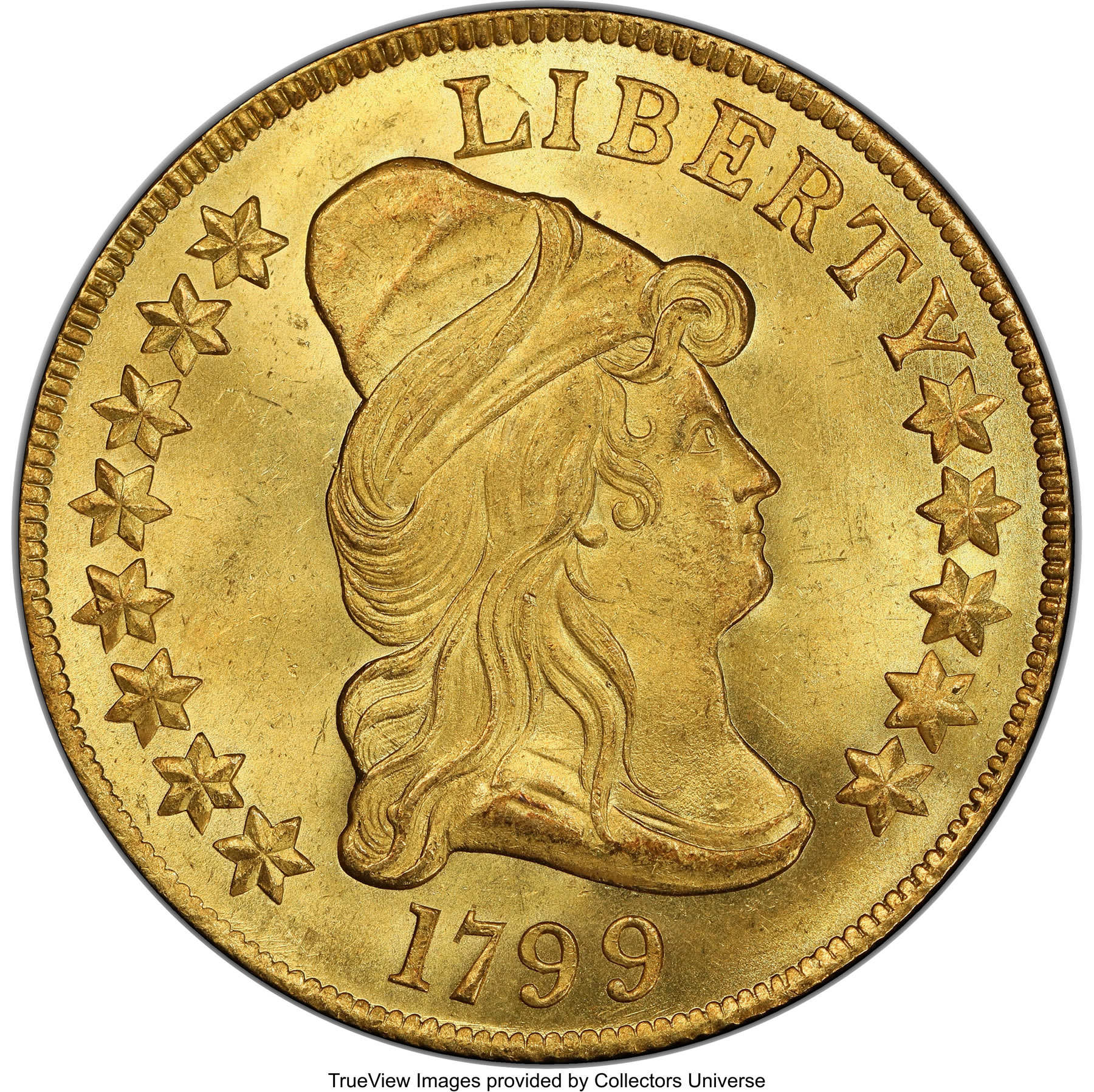 A 1799 $10 Large Obverse Stars, BD-10, R.3, MS66 PCGS, tied for the finest known of the variety, is one of just three early eagles that PCGS has certified MS66; the third is a 1795 Small Eagle ten dollar gold piece that PCGS grades MS66+.