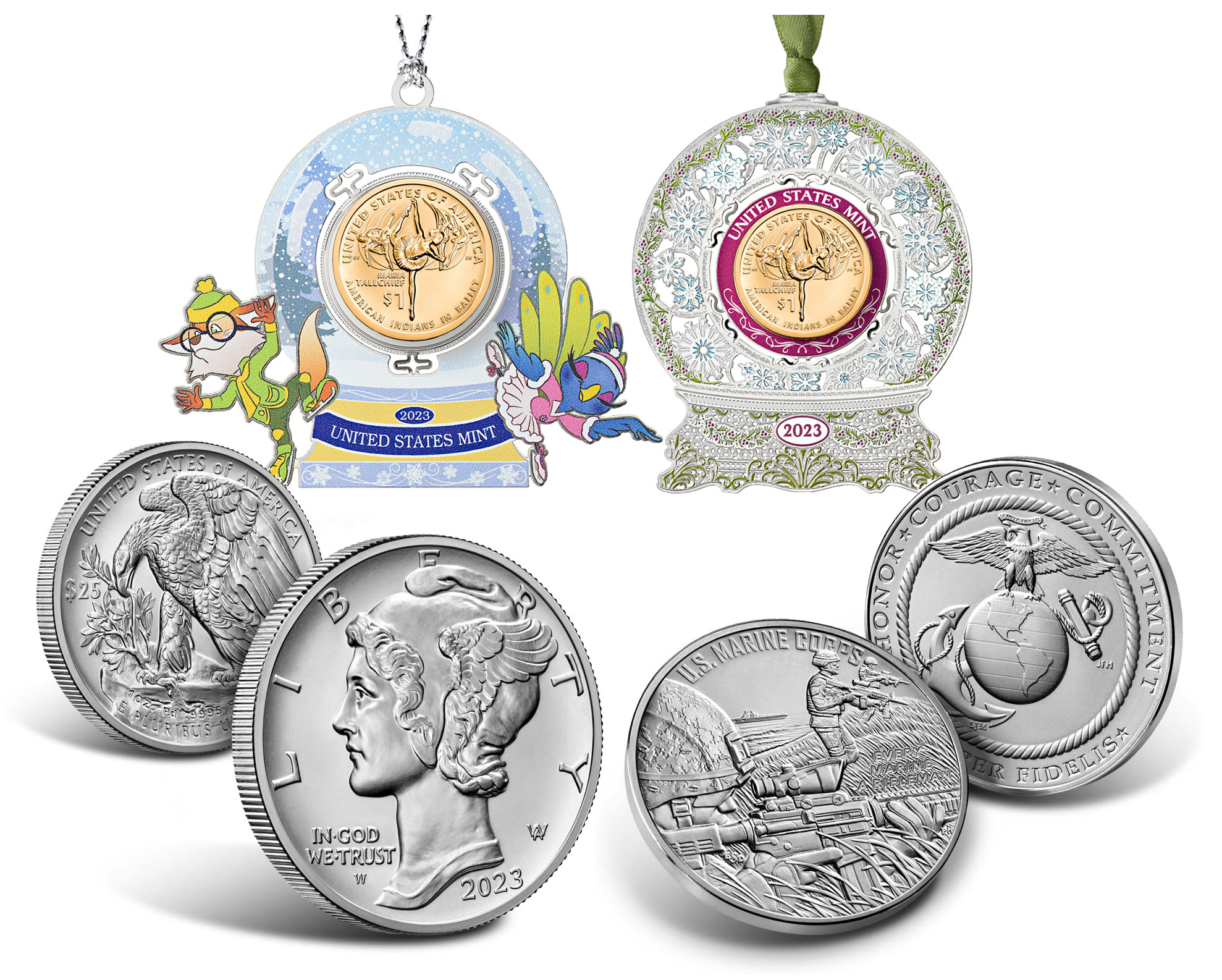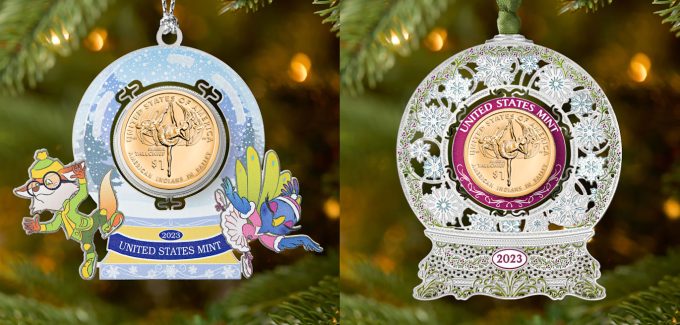 This year’s holiday products feature specially designed ornaments that center around the 2023 Native American $1 Coin and its one-year-only design featuring Maria Tallchief and four additional dancers in balletic pose.