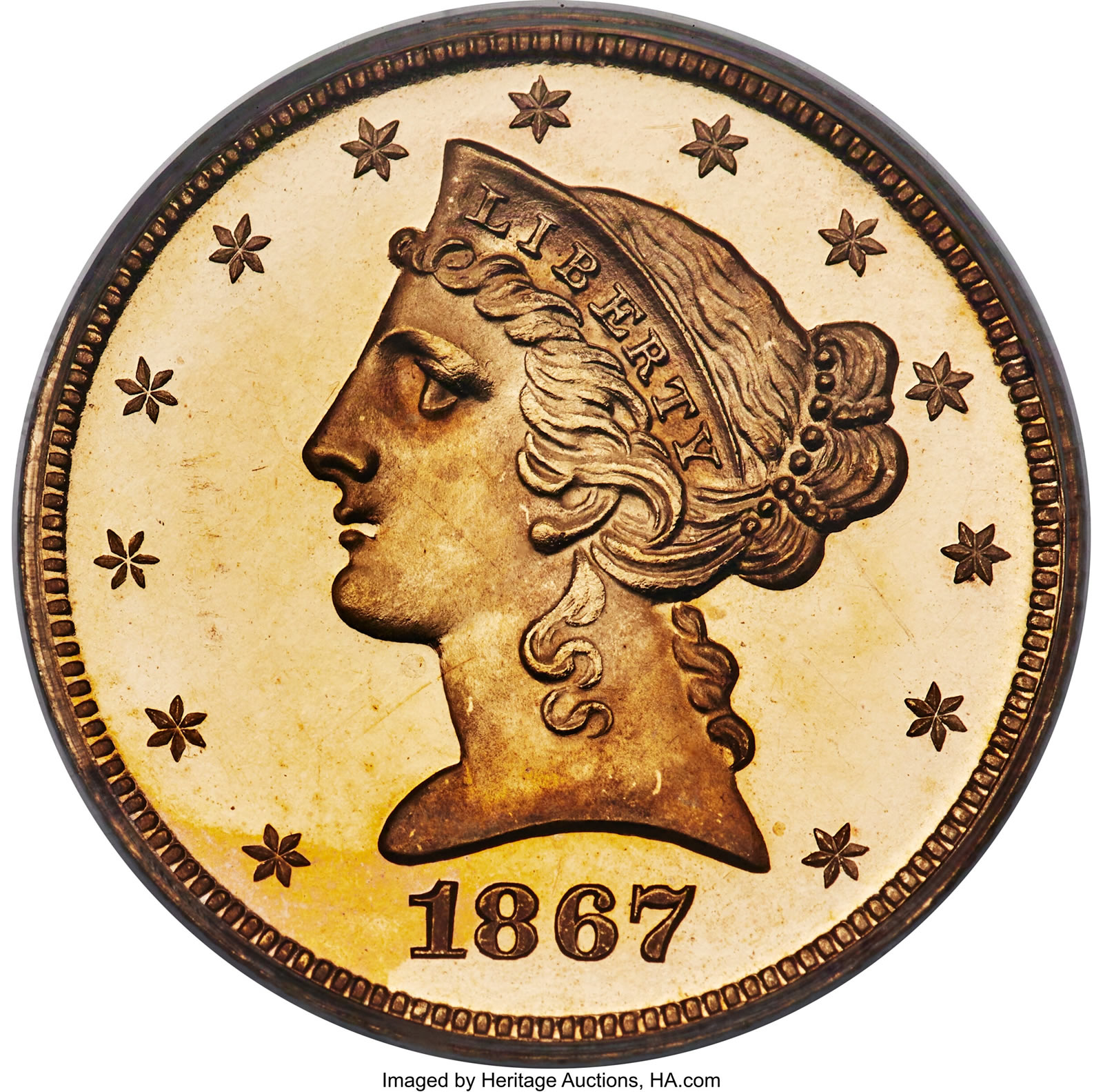 - An 1867 Half Eagle, PR65 PCGS — the former Garrett-Bass example