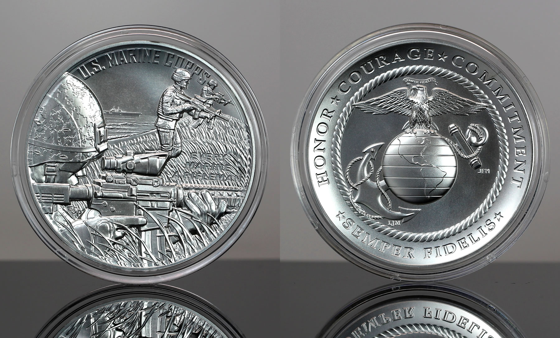 Military and medal enthusiasts will want to take note that today, at noon ET, the United States Mint is launching the U.S. Marine Corps 1 Ounce Silver Medal. The medal is composed of 1 troy ounce of 99.9% silver and features designs that honor the United States Marine Corps and its history.