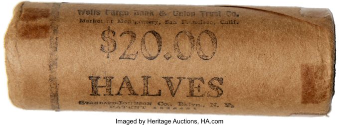 A 1945 Wells Fargo Original BU Roll of Half Dollars: $12,000