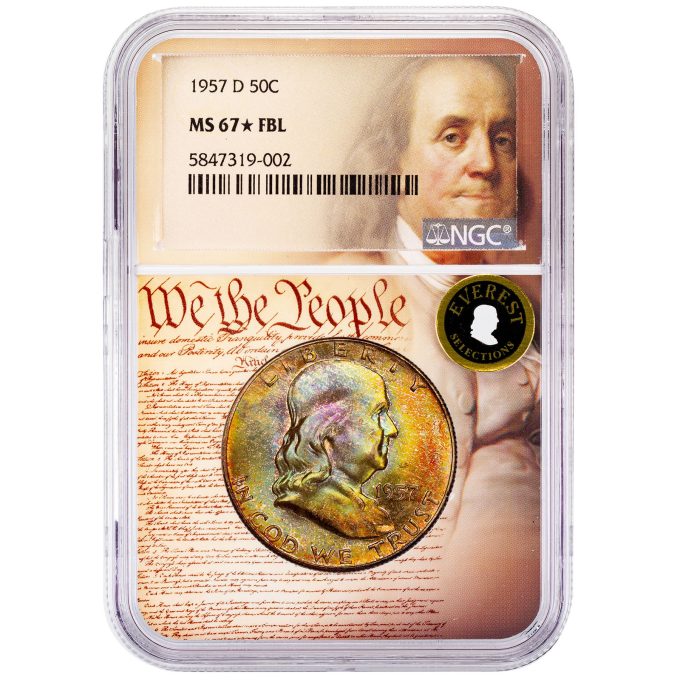- 1957-D Franklin half dollar NGC MS67 Star Full Bell Lines. "On both obverse and reverse, this is simply the most beautiful high-grade 1957-D I have ever seen," said Tomaska. "This coin is from a mint set, and most mint set-toned 1957-D’s have lackluster dull toning. This specimen exhibits the most beautiful toning for a 1957-D. Both the obverse and reverse are equally stunning! On a scale of 1 to 10, this is as close to a perfect 10 as any 1957-D known! And it is MS67 FBL. There are no MS68s!"