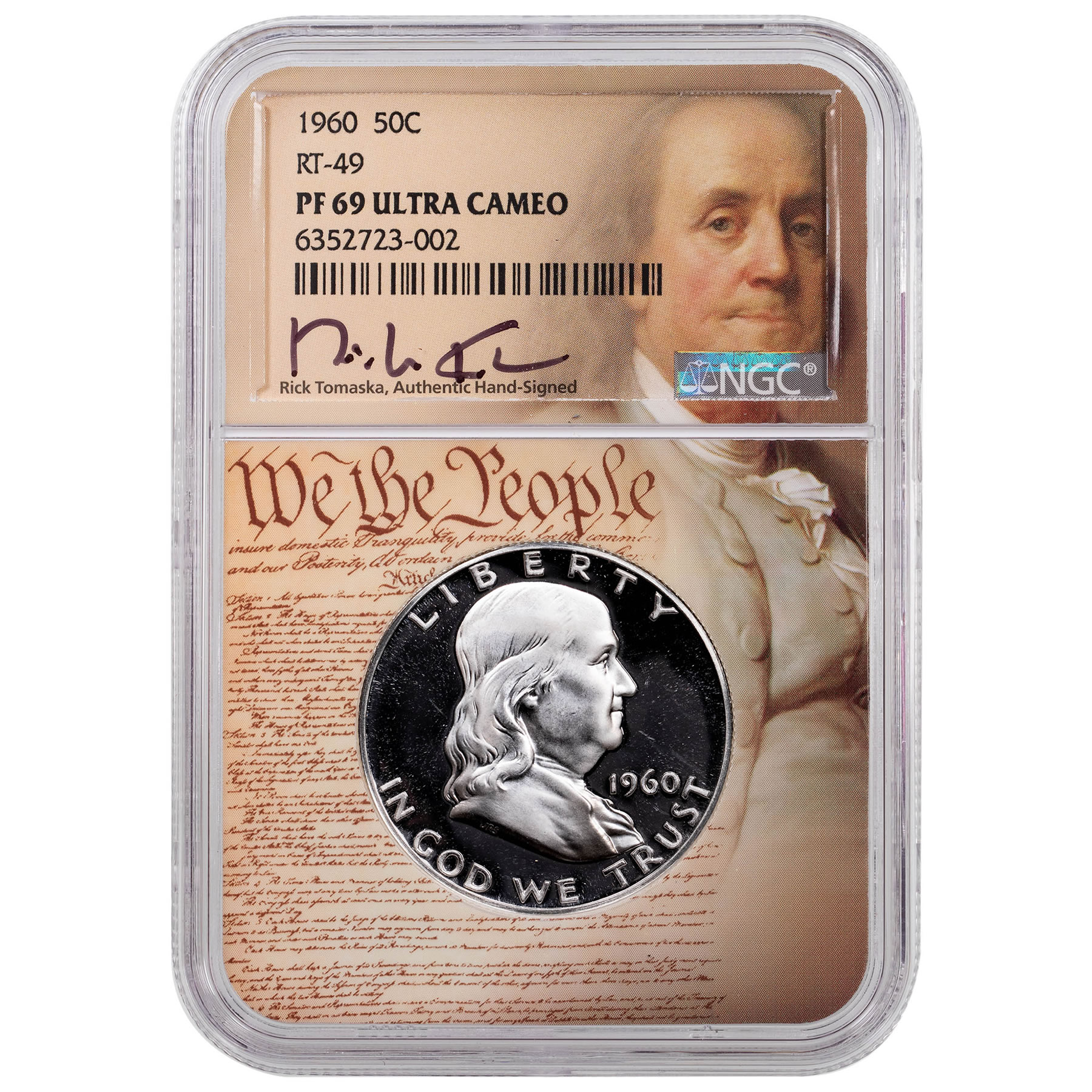 - 1960 Franklin half dollar NGC PF69 Ultra Cameo. "This 1960 has one of the biggest cameos ever seen on a proof Franklin half dollar. I believe it has to be one of the earliest strikes, perhaps the first 10 to 20 coins, to have the cameo contrast you see on this coin. And it’s a PF69. Most of the known early strike examples have a few hairlines or milk-spots. This specimen is perfect," stated Tomaska.