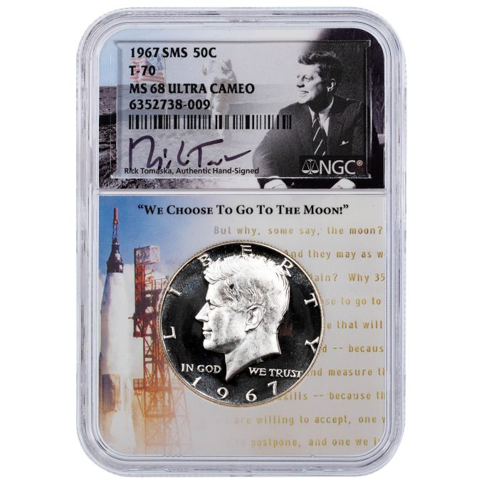 - 1967 Special Mint Set Kennedy half dollar, T-70 NGC MS68 Ultra Cameo. "This is the finest known specimen," explained Tomaska. "Only the earliest examples in the Special Mint Sets (SMS) produced from 1965 to 1967 displayed the level of cameo contrast you see on this coin. SMS coins were not individually handled as were proof coins, but were just dumped into bins. So, for this earliest strike to survive in essentially flawless MS68 is miraculous!"