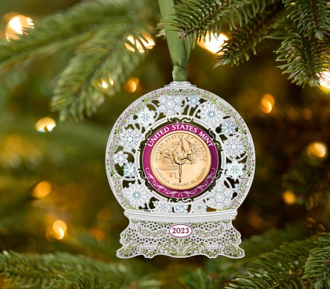 The 2023 United States Mint Holiday Ornament, designed with a more traditional adult-oriented style, marks the fifth annual release in the series. Each ornament is shaped like a snow globe and crafted from solid brass with an imitation rhodium finish.