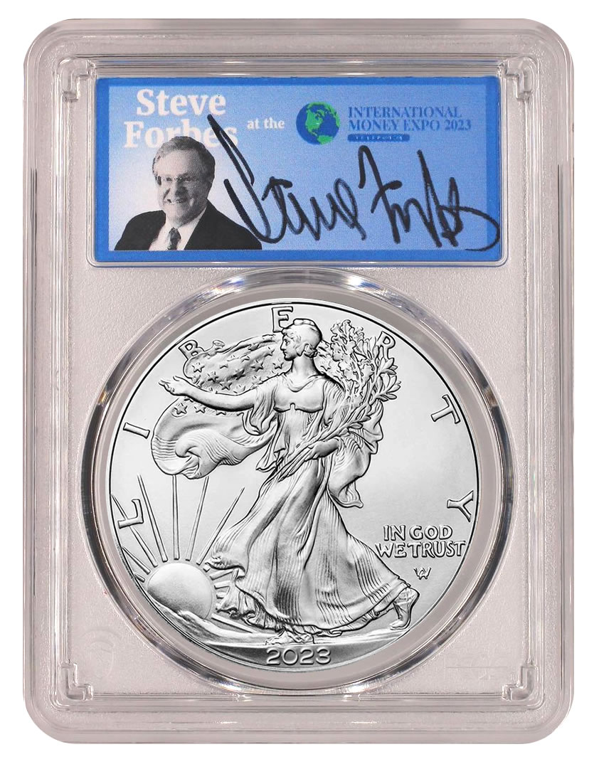 PCGS-certified American Silver Eagle bullion coins with a special insert autographed by Steve Forbes will be available while supplies at the first International Money Expo (www.imex.show) in the Music City Center in downtown Nashville on Friday and Saturday, October 27 and 28, 2023.