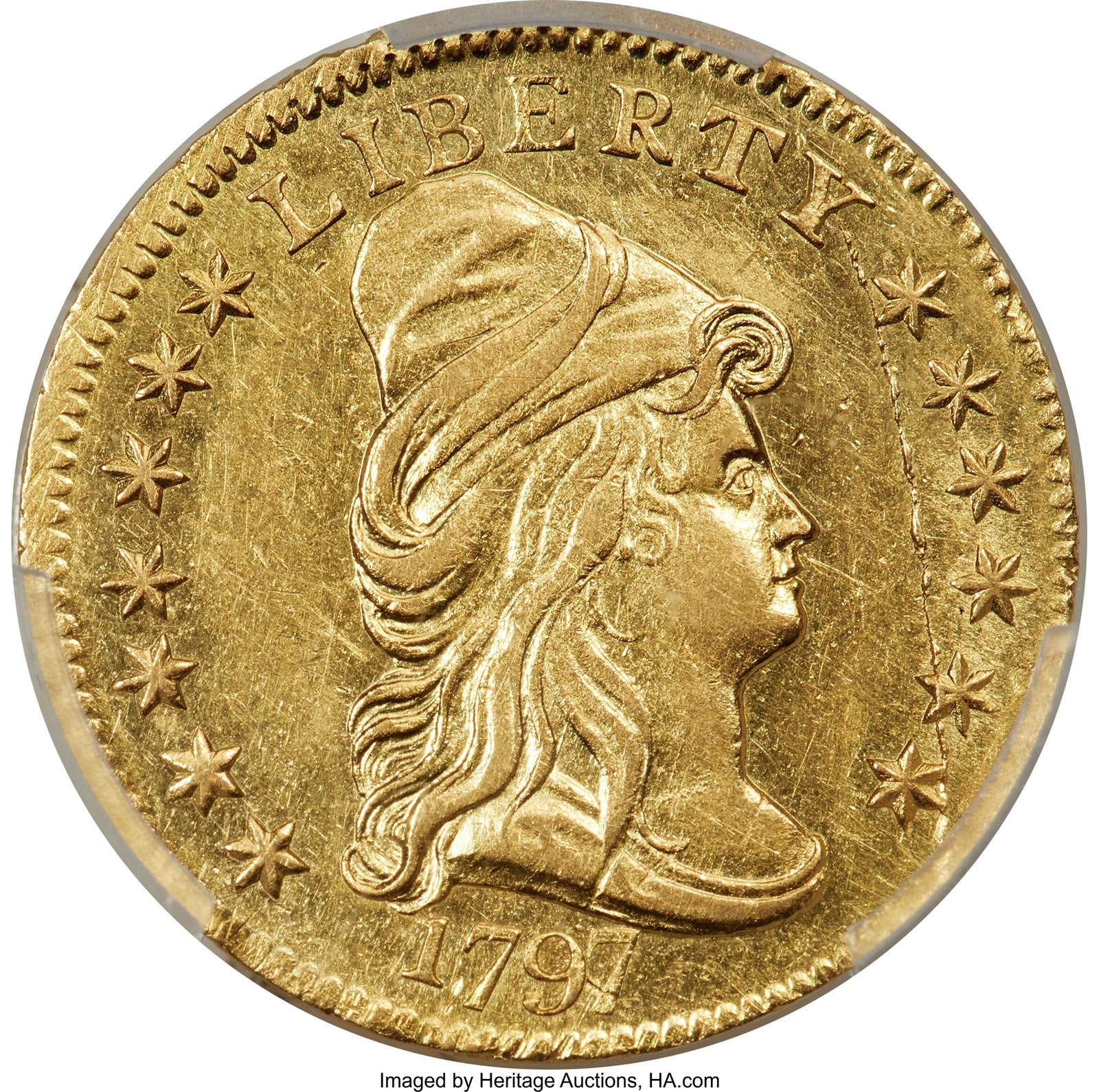 1876 Three Dollar Gold Piece, PR65 - A 1797 Capped Bust Right Quarter Eagle, AU55 PCGS – a rarity from an official mintage of just 427 pieces. There was little commercial demand for quarter eagles in the national economy in 1797, as the face value of the coin was too small to be useful in settling large accounts in foreign trade, but too large to be convenient in everyday transactions.