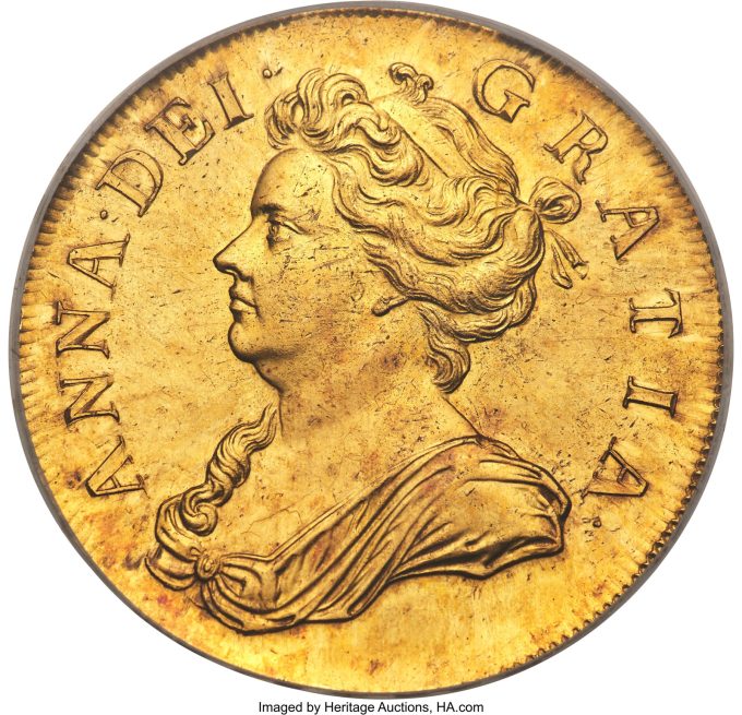 The auction’s top lot was not the lone record set in the event. An Anne gold 5 Guineas 1706 MS63 PCGS more than doubled its low pre-auction estimate when it brought in a winning – and record-setting – bid of $408,000. This coin is the sole finest pre-Union issue and one of only two Anne 5 Guineas across both grading services to receive a full Choice Mint State designation.