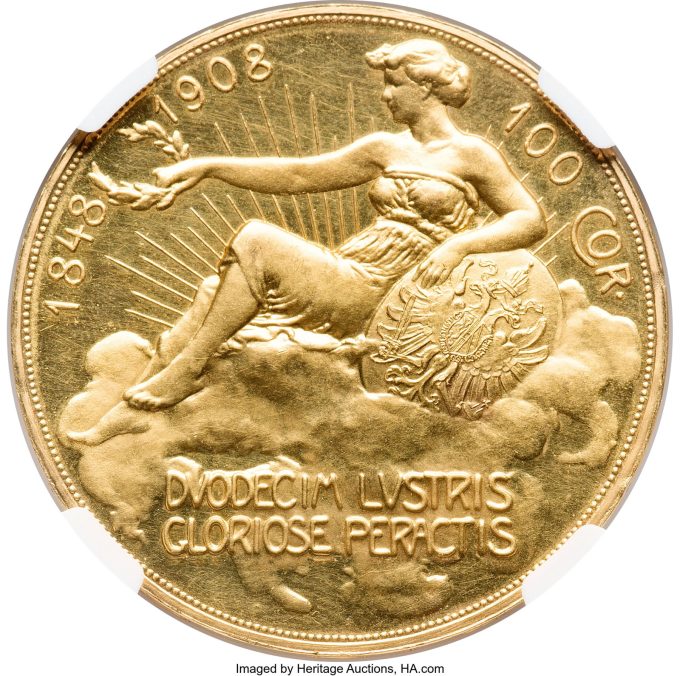 Atop the Signature Session was a Franz Joseph I gold Proof "Lady in the Clouds" 100 Corona 1908 PR62 Cameo NGCthat drew a winning bid of $33,600.