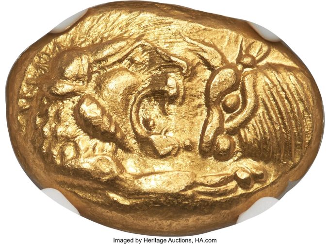 - A LYDIAN KINGDOM. Croesus (561-546 BC). AV stater NGC MS 5/5 – 3/5, light scuffs: $33,600