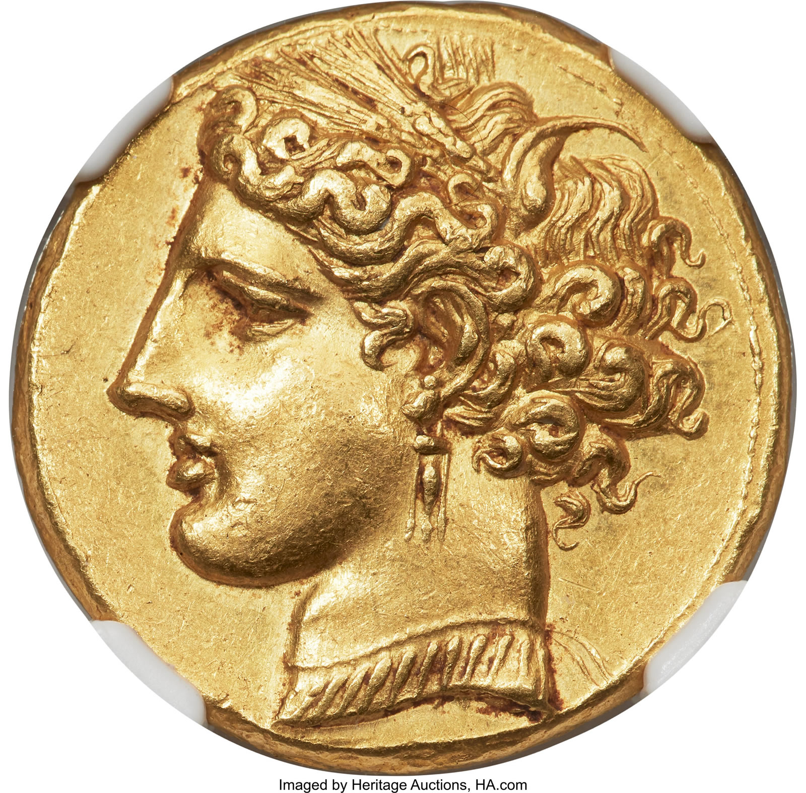 The ancient coins in the auction included the Wetmore Collection of Gold and Electrum – a carefully curated trove of 74 coins, each embodying a unique blend of history and artistry. Leading the collection was a ZEUGITANA. Fine Style Carthage. Ca. 270-260 BC. AV trihemistater, a large gold piece from the Phoenician colony of Carthage, on the coast of North Africa, that sold for $60,000.
