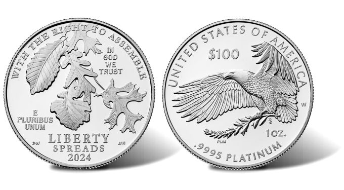 Premiering today at Noon EST, the 2024-W First Amendment to the United States Constitution Platinum Proof Coin – Right to Assemble marks the fourth of five unique designs from the United States Mint.