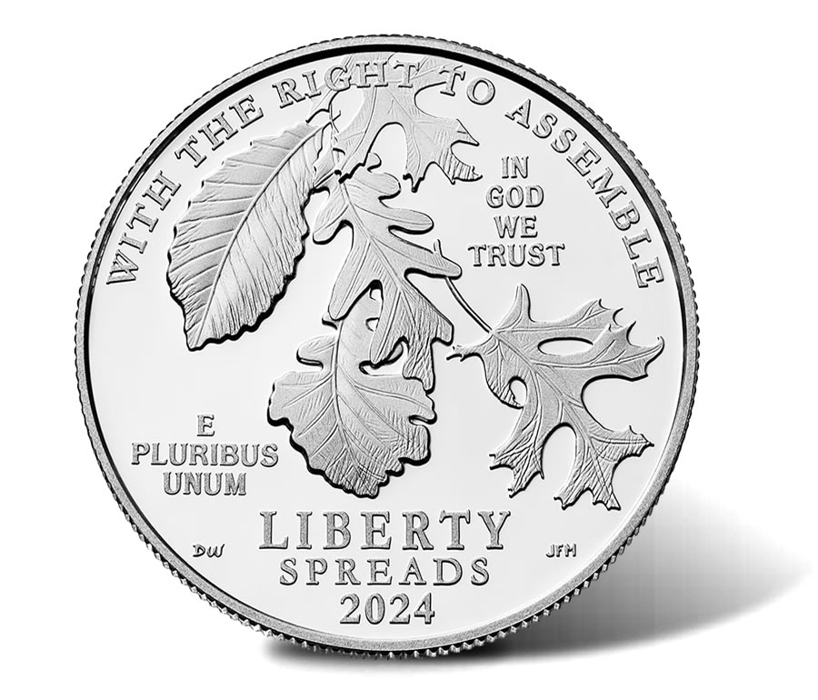 The 2024 obverse design features several types of oak leaves assembled between the inscription "WITH THE RIGHT TO ASSEMBLE LIBERTY SPREADS." Additional inscriptions include "IN GOD WE TRUST," "E PLURIBUS UNUM," and "2024."