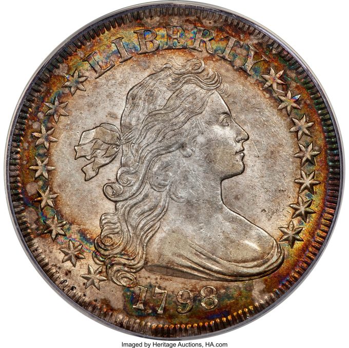 More than three dozen bids poured in for a 1798 Draped Bust Dollar Small Eagle, 15 Stars, B-2, BB-81, R.3, MS61 PCGS, driving it to a record for the variety of $216,000, surpassing the previous record of $129,250 set by the same coin in 2013 at Heritage Auctions.