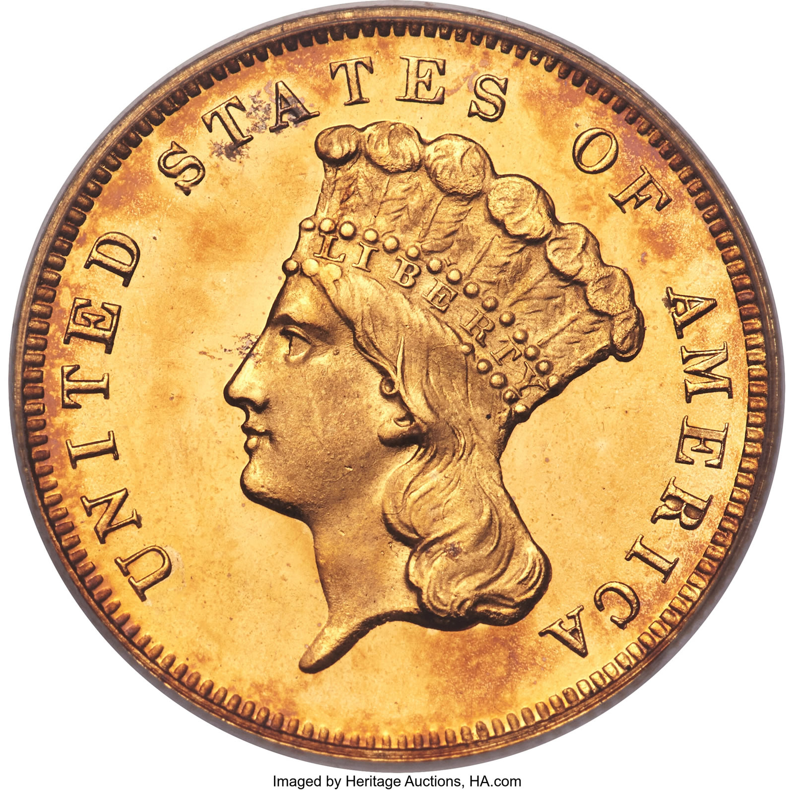 An 1876 Three Dollar Gold Piece, PR65 Deep Cameo PCGS. CAC drew a winning bid of $132,000. This sought-after proof-only rarity represents the scarcer JD-2 variety, the surviving population of which John Dannreuther estimates at no more than 16-20 examples in all grades.