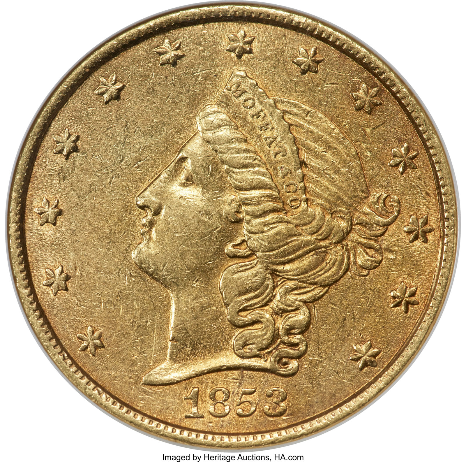 An 1853 Moffat & Co. Twenty Dollar, AU55 NGC, CAC, K-19 is one of only about 50 examples believed to have survived. Moffat twenty dollar gold pieces were produced toward the end of the Territorial gold issues of the California Gold Rush, in response to one of the recurring shortages of gold coinage that were so prevelant in the region.