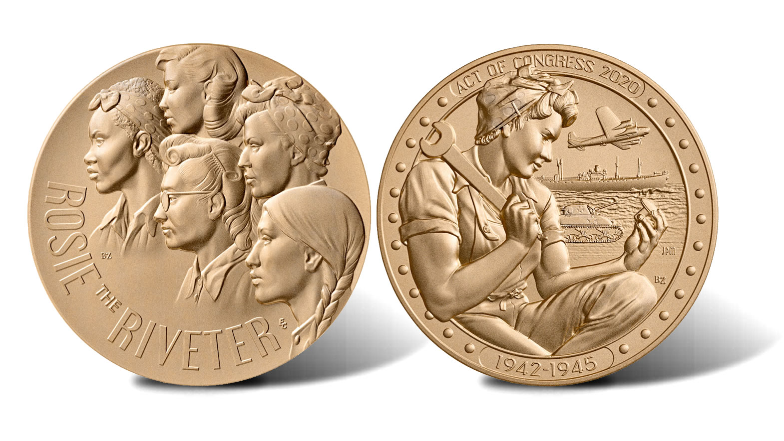 The United States Mint has started selling Rosie the Riveter bronze medals, which are now available in 1.5-inch and 3.0-inch sizes. These medals share the same designs as the congressional gold medal honoring "Rosie the Riveter," the women who worked or volunteered in support of the war efforts during World War II.