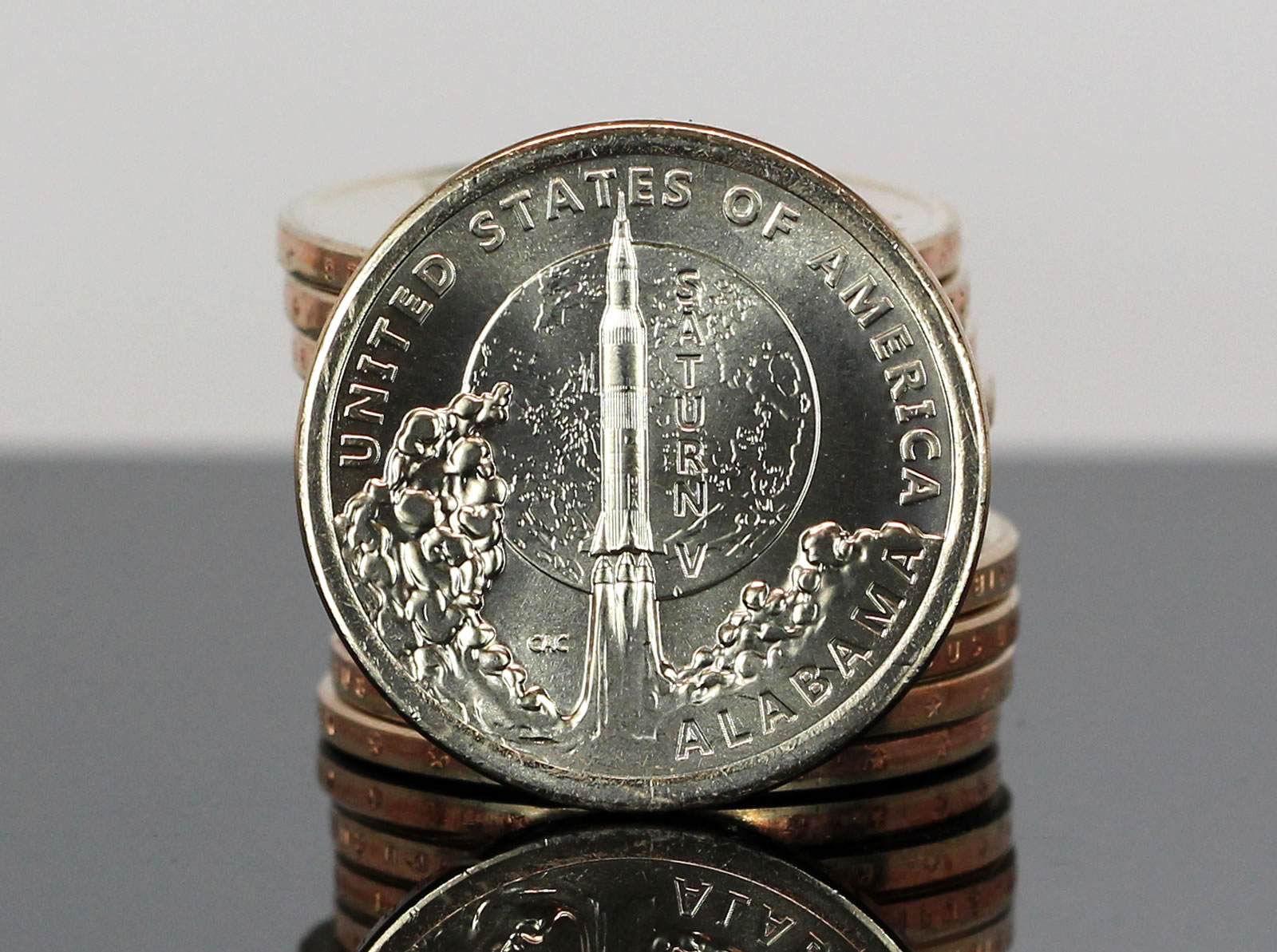 Last week, on April 8, the U.S. Mint released rolls and bags containing Innovation dollars for Alabama. These $1 coins feature a design depicting a Saturn V rocket lifting off against the background of the Moon.