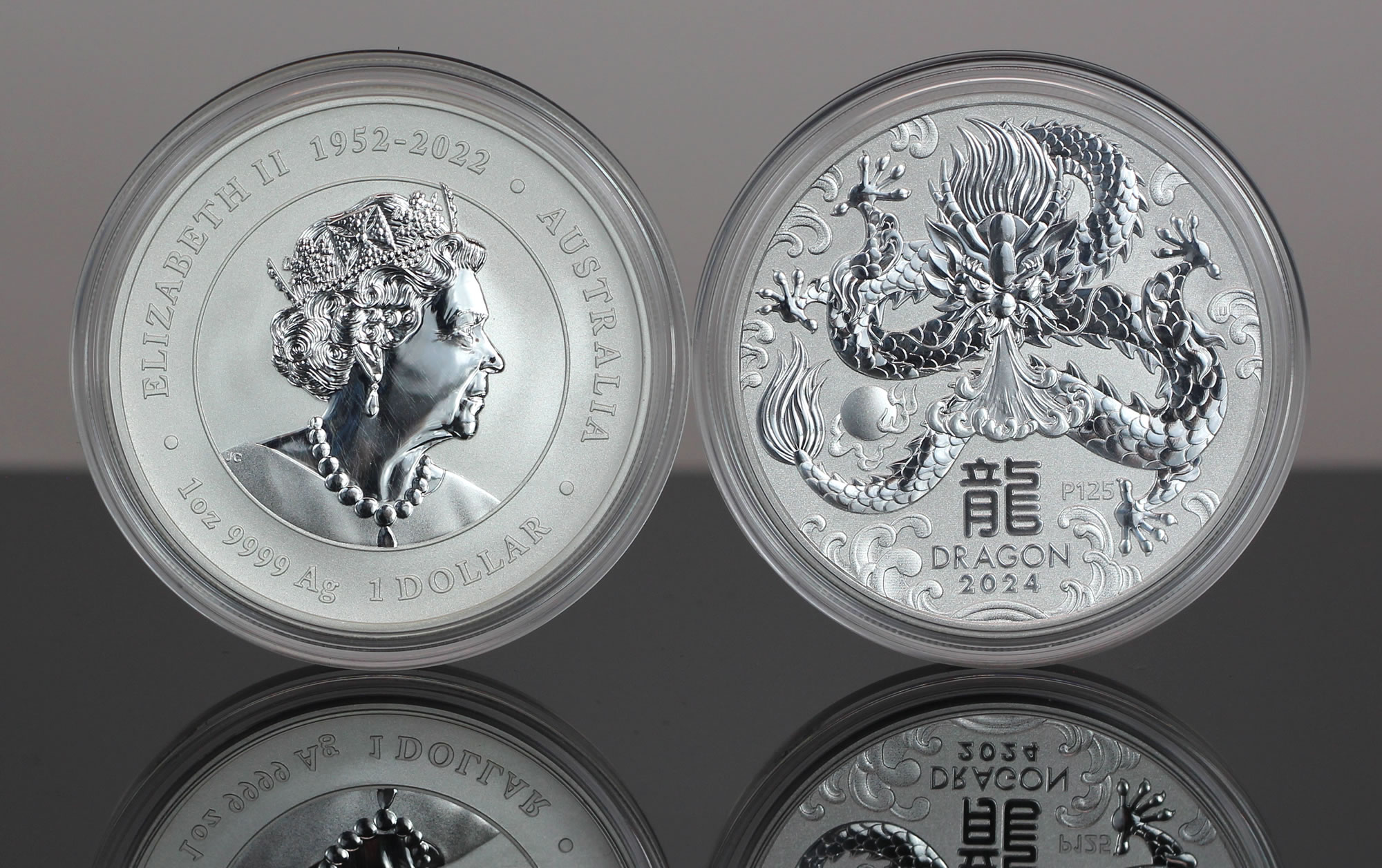 - Australian Lunar Series III 2024 Year of the Dragon 1oz Silver Bullion Coin with Dragon Privy