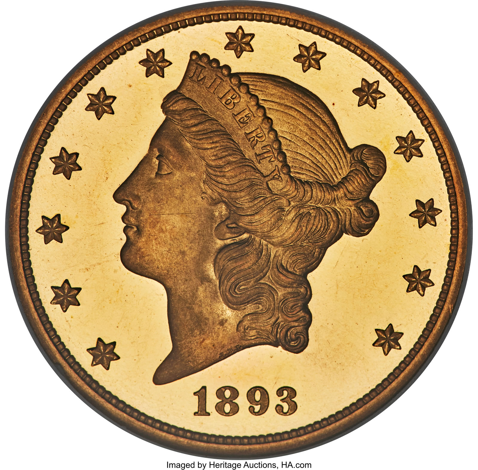 Whatever the reason, the 1893 proof Liberty double eagle is an elusive issue in all grades today: PCGS and NGC have combined to certify only 13 specimens between them, with this coin being the single finest. Another double eagle – an 1896 Liberty Twenty, PR66 Deep Cameo PCGS – reached $300,000.