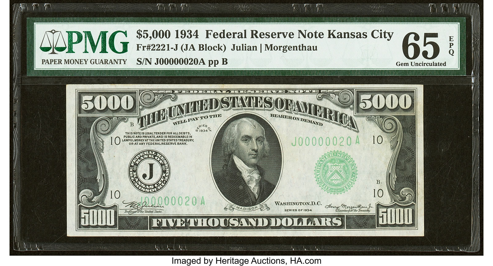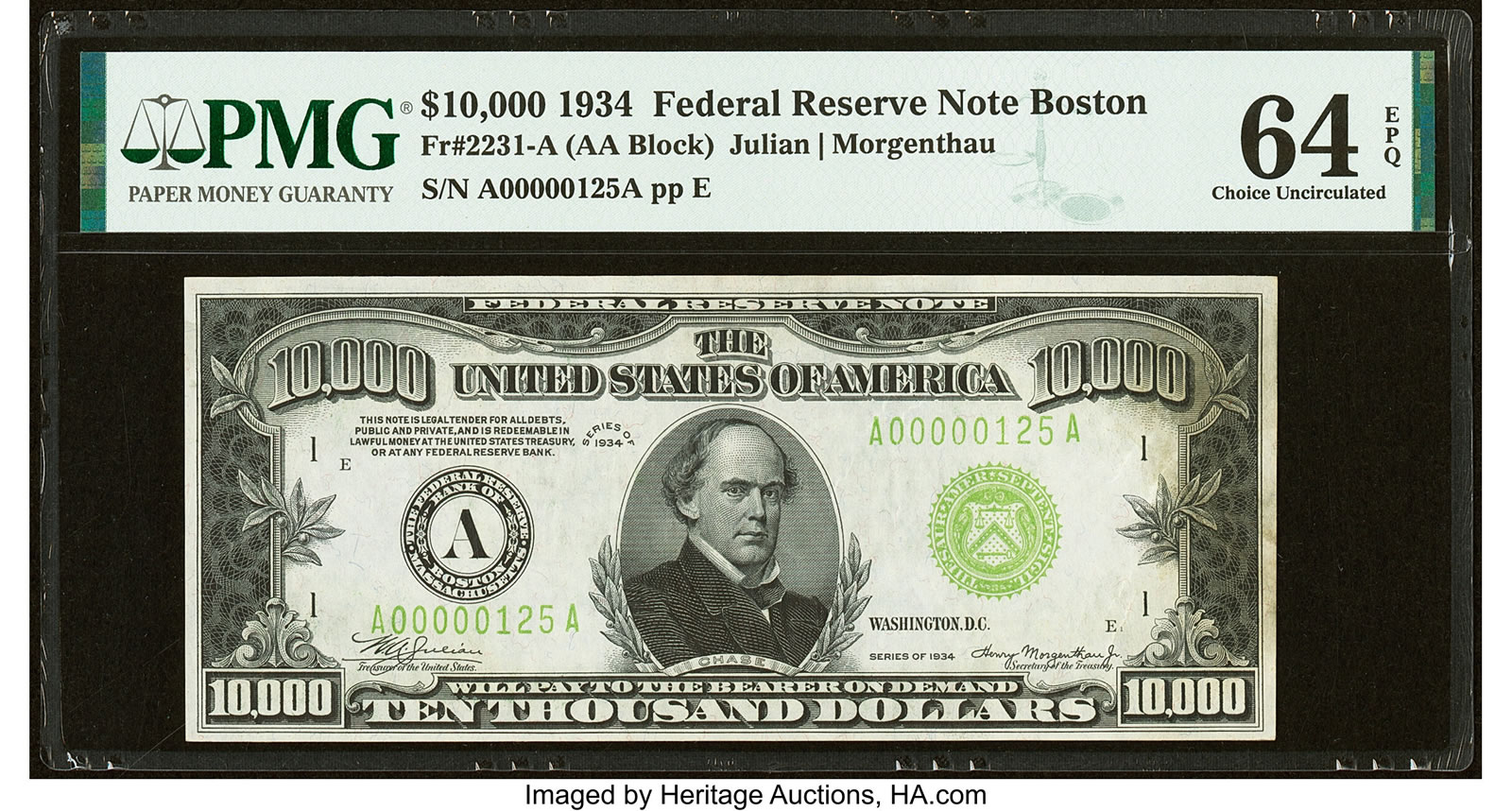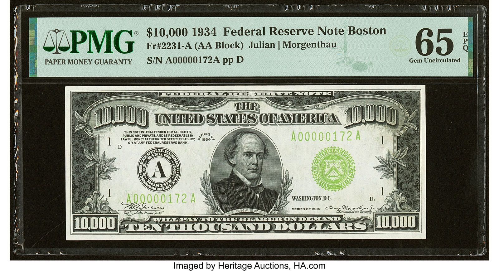 A fully original Fr. 2231-A $10,000 1934 Federal Reserve Note. PMG Choice Uncirculated 64 EPQ pulled in a winning bid of $336,000. It is a rarely seen high grade, where strictly original notes are rare. Fewer than 25% of $5,000s and $10,000s are still fully original, or without any restorations.