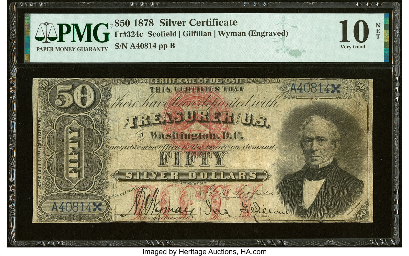 A Series 1878 Triple Signature $50 Silver Certificate, among the rarest of all Federal notes, brought $312,000. Through the Bland-Allison Act, the Silver Certificate was created as an instrument to support the massive influx of newly minted silver dollars into Treasury vaults, because they were easier and cheaper to distribute to banks, but fell short of "full" Legal Tender status. Only six survivors are known; of those, one is in the ANA Museum, and two more are part of the San Francisco Federal Reserve holdings. One of just three in private hands, this example has the longest and most esteemed pedigree, having been part of the Albert A. Grinnell Collection, then included in the collections of Aaron R. Feldman and Thomas F. Morris.
