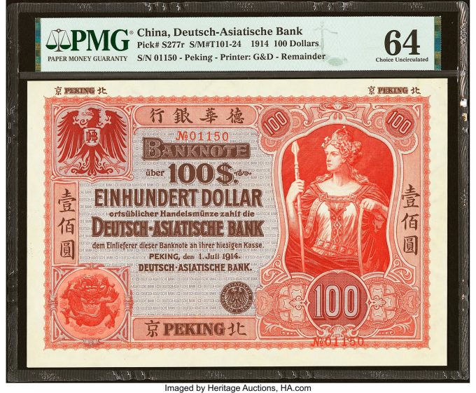 A beautiful and exotic China Deutsch-Asiatische Bank, Peking 100 Dollars 1.7.1914 Pick S277r S/M#T101-24 Remainder PMG Choice Uncirculated 64 is so rare — at the time of cataloging, PMG has graded just 13 of these Peking Remainders — that they are coveted by collectors worldwide. Of the notes issued by the German-Asian Bank in China and its colony in Kiau Chau from 1907 until the end of World War I, two series, denominated in Dollars and Taels, were issued featuring either the 1907 or 1914 date. Notes from this issuer shared a common design across all branch cities: Shanghai, Peking, Tsingtau, Hankow and Tientsin. This denomination is only known in Remainder and possibly Specimen form.