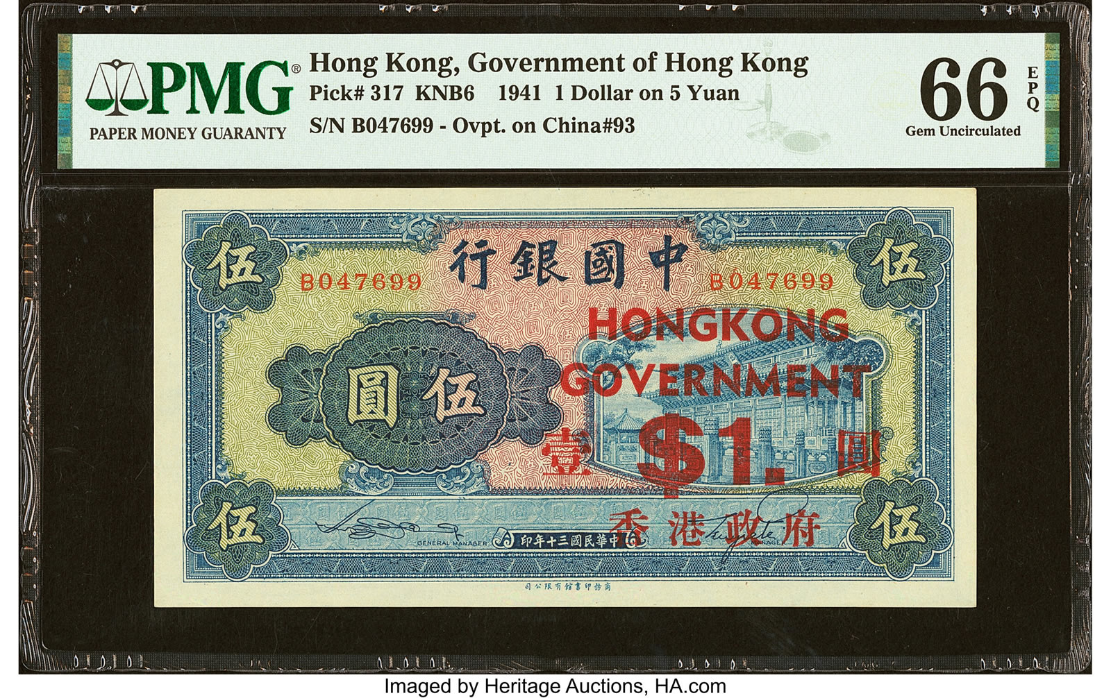 A Hong Kong Government of Hong Kong 1 Dollar on 5 Yuan 1941 Pick 317 KNB6 PMG Gem Uncirculated 66 EPQ is the single finest-graded Hong Kong $1 overprint from World War II in the PMG Population Report. Merging top quality and unquestioned rarity, this note was issued in World War II-era Hong Kong and somehow escaped circulation, allowing it to retain complete originality and pristine paper after more than six decades.