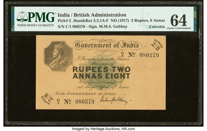 An India Government of India, Calcutta 2 Rupees, 8 Annas ND (1917) Pick 2 Jhunjhunwalla-Razack 3.3.1A-G PMG Choice Uncirculated 64 features an outstanding grade on a note with an uncommon denomination. The 2 Rupees 8 Annas is a seldom-seen middle denomination in the government’s series of notes; this type may have been issued to bridge the gap between small denominations, or to give the public a new note to use as silver was being hoarded during the first World War. The note was issued across major cities, which are identified by the prefix letter; this Calcutta issue is original and saved in Uncirculated, helping it become one of the most famous of all Indian paper notes.