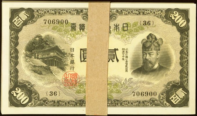 - A Japan Bank of Japan 200 Yen ND (1945) Pick 44a Pack of 100 Notes Crisp Uncirculated