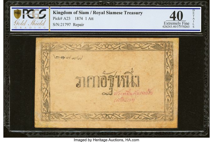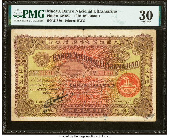 Macau Banco Nacional Ultramarino 100 Patacas 22.7.1919 Pick 9 PMG Very Fine 30 - A Thailand Royal Siamese Treasury 1 Att = 1/64 Tical ND (1874) Pick A23 PCGS Gold Shield Extremely Fine 40 Details