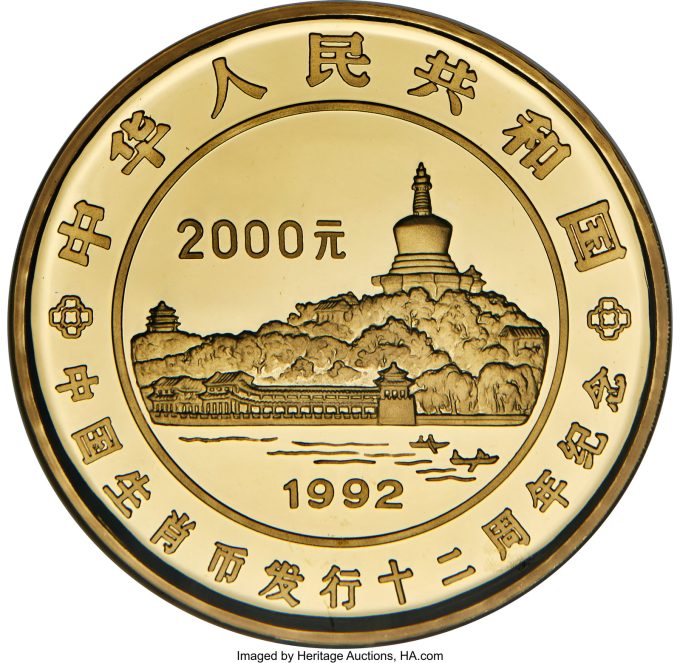 A People’s Republic gold Proof "Seismography" 2000 Yuan (1 Kilo) 1992 PR68 Ultra Cameo NGC, from the Shenyang Mint, is from the Scientific Inventions and Discoveries of Ancient China Series. The certificate indicates that it hails from a tiny mintage of just 10 pieces, although Chan suggests the mintage actually included 16; a record has been found of just one other example being offered at public auction, in 2003.