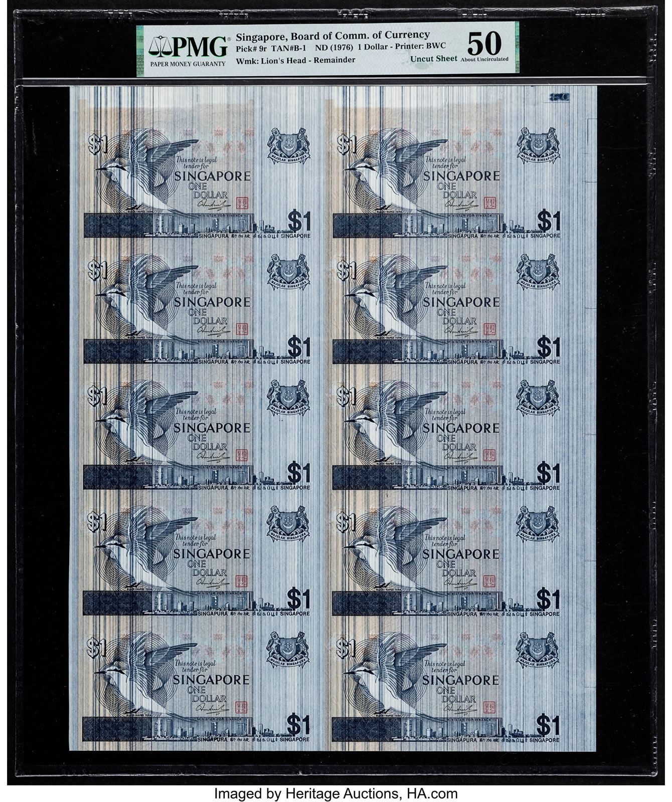 Singapore Board of Commissioners of Currency 1 Dollar ND (1976) Pick 9r TAN#B-1 Uncut Sheet of 10 Remainders PMG About Uncirculated 50 - A Macau Banco Nacional Ultramarino 100 Patacas 22.7.1919 Pick 9 PMG Very Fine 30